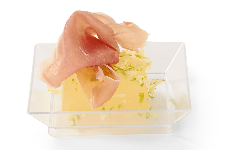 2. Die Melonenwürfel aus dem Vakuum nehmen, etwas frische Limettenschale darüber reiben und eine Scheibe rohen Schinken darauflegen.