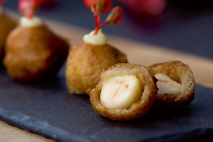 - Dip the apple caramel balls in the batter and fry at 180°C.