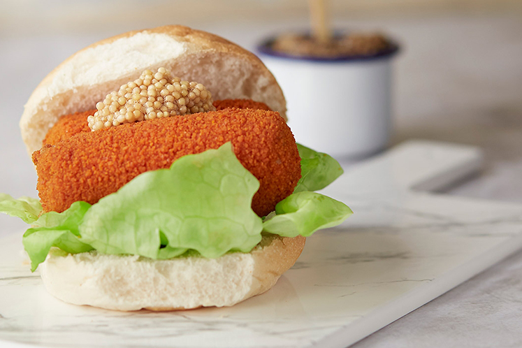 - Servez les croquettes sur le petit pain blanc avec les graines de moutarde tendres et la moutarde à l'ancienne.