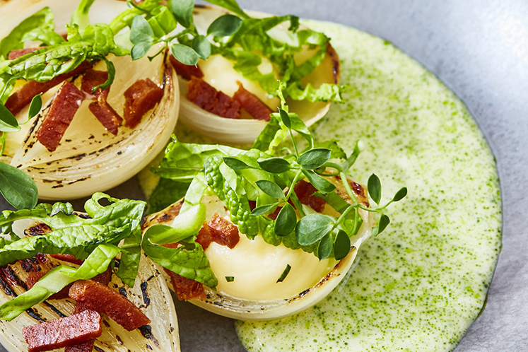 Oeuf des Cévennes avec nobacon fumé, fromage Remeker, amsoi et beurre blanc.