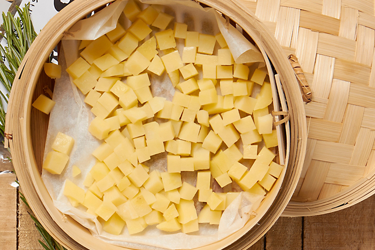 1. Épluchez la pomme de terre et coupez-la en brunoise. , Déposez-la sur une feuille de cuisson vapeur dans le panier vapeur.