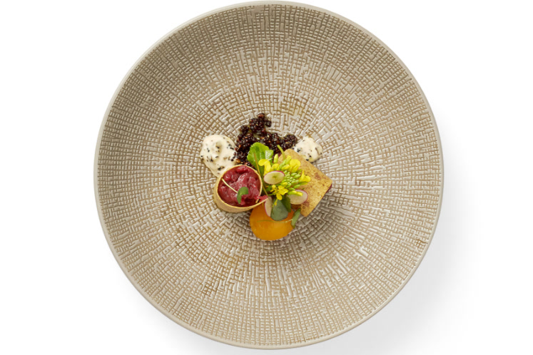 - Remplissez les cylindres de pomme de terre avec le tartare de chevreuil et disposez-les sur l'assiette. Ajoutez le jaune d'œuf à côté. Déposez un peu de mayonnaise à la truffe à côté et enfin une cuillerée de quinoa noir soufflé et un brin de fleur de moutarde.