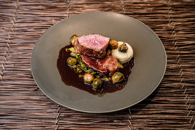 2 bereidingen van kalf, spicy spitskool met een portsaus met zwarte bes.Dit recept is voor 10 personen en is geserveerd tijdens de Chef's Table bij HANOS Hengelo op 10 december 2022.