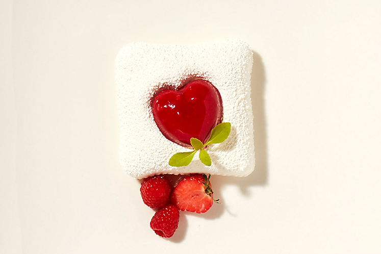 Een kussen van witte chocolade met crispearls en daarop een glanzende parfait amour.De basis van dit dessert is de siliconenmal 'Ti voglio bene', deze bestaat uit een kussen met een hart erin.Benodigdheden