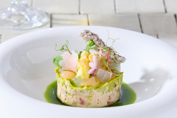 Rilette van gerookte makreel met doperwt, asperges en dille.Rilette van gerookte makreel met een puree van doperwt met dragon, asperges, gel van grapefruit, gelei van zeewater, olie van dille en een krokantje van tapioca.