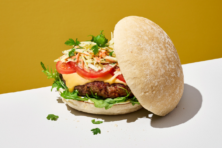 - Beleg het broodje met rucola en leg hierop de burger met smeltende cheddar, beleg dit met tomaat en coleslaw.
