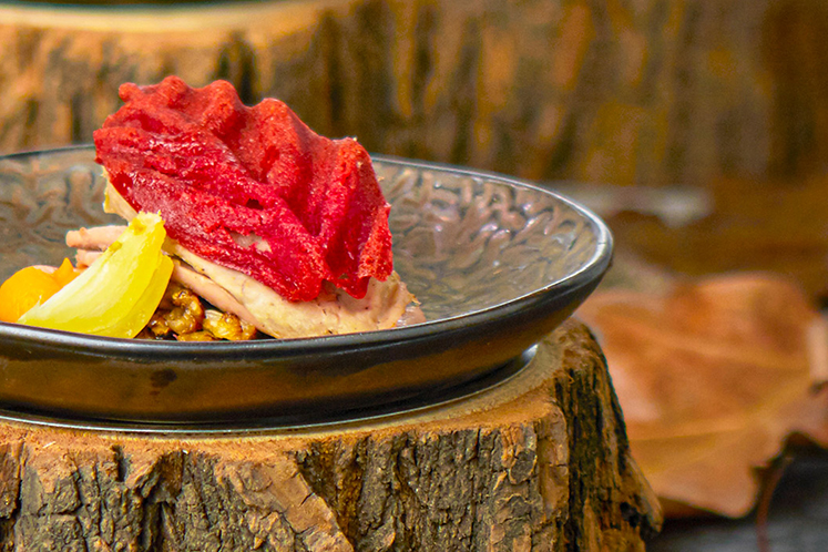 Een amuse met warme, aardse smaken en een vleugje zoet. Passend bij het seizoen gepresenteerd in de vorm van herfstblaadjes.