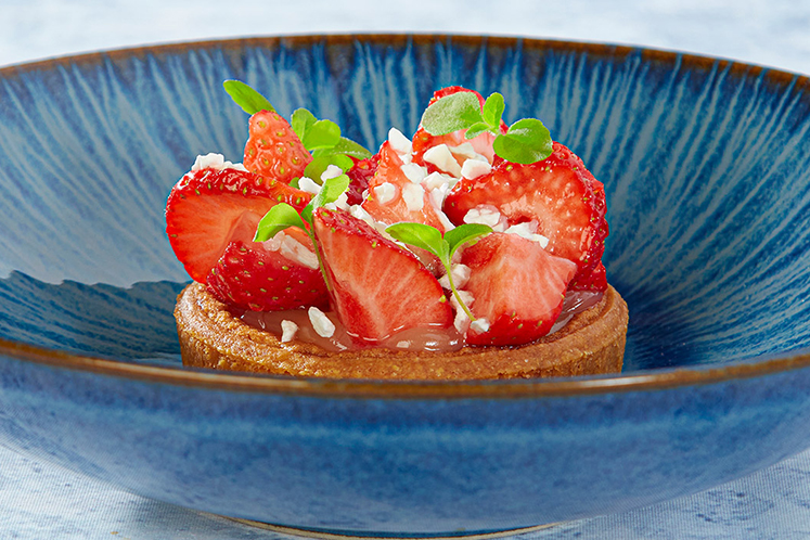 Bordalou heeft een krokante korst en een zacht romige vulling. In deze bereiding met een frisse lemoncurd met daarop in vlierbloesemsiroop gemarineerde aardbeien. De yoghurtcrumble maakt het lekker fris.