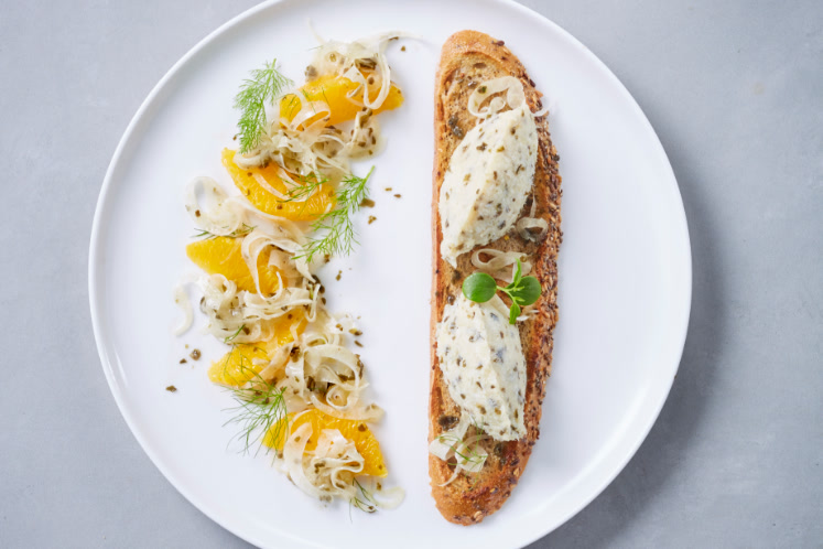 - Maak een quenelle van de brandade en serveer op een sneetje toast met de venkel-sinaasappelsalade aan de zijkant.