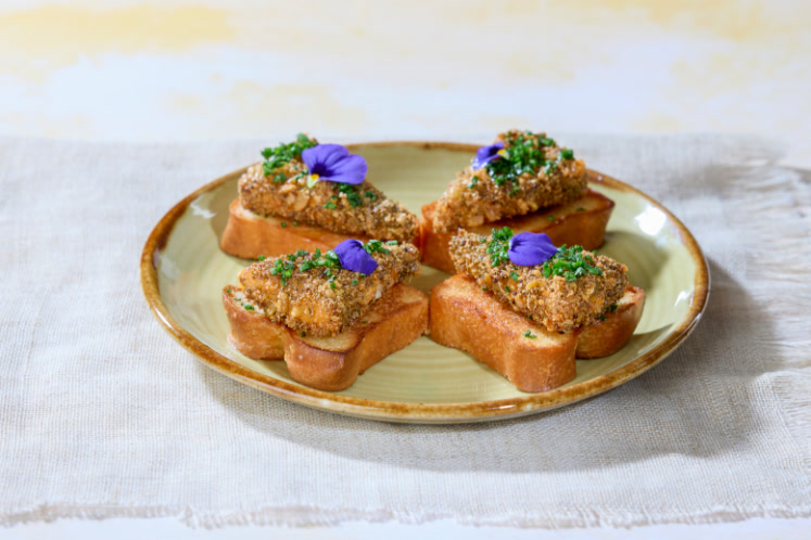 In beurre noisette uitgebakken brioche met manchego in krokante groene kruidenkorst en geserveerd met bieslook en truffelhoning.Benodigdheden