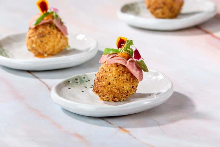 Balletjes met een vulling van buffelricotta, lamsham en Parmezaan.Gepaneerd in een mix van panko en schug, afgemaakt met een puttanescacrème en asperge.
