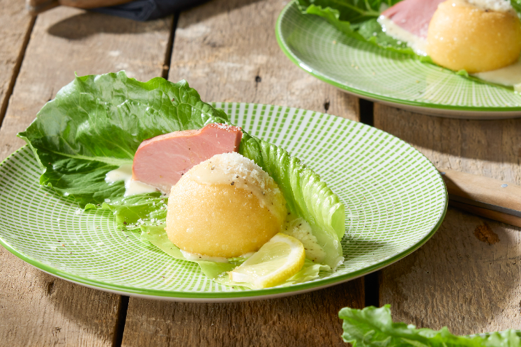 6. Leg de kaasbollen op een blad romaine sla.