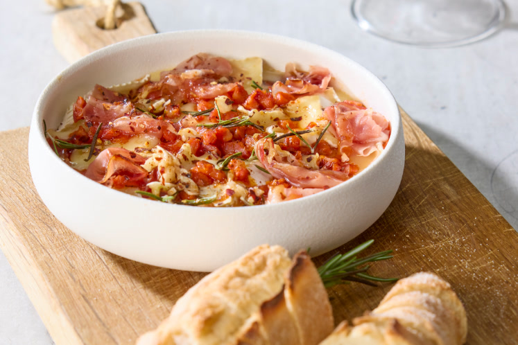 En heerlijk warme camembert, rijkelijk getopt. Perfect als voorgerecht voor twee, maar ook zeker als alternatief borrelgerecht. Laat je gasten zelf de warme kaas ‘lepelen’ met brood.Benodigdheden