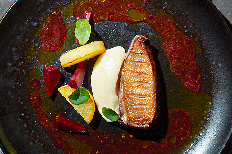 Dit gerecht bestaat uit: bramensaus, pani puri gevuld met vlees van de bout, canetonfilet, gekonfijte aardappel, pastinaakpuree en bietjes.Wijntip: De Leidersburg (8556070) is een pinot noir met een granaatappelrode kleur en een neus van klein rood fruit, jeneverbes en toast. De smaak is elegant met fijne tannines en zuren. Een afdronk vol rood fruit, specerijen en zwarte bessen.