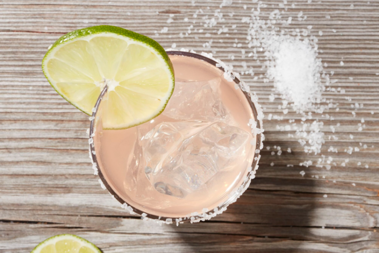 - Top met bruisend water en garneer met een zoutrand, suikerrand en grapefruitpartje
