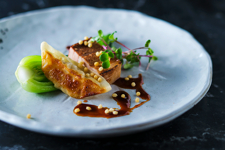 - Leg de paksoi op het bord en leg hier een gyoza tegenaan samen met een stukje Char Siu.