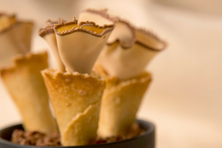 - Bestrooi de hoorntjes met florentinermix en zet ze een paar minuten op 180°C in de oven. Let op: de hoorntjes vervormen in de oven, breng ze meteen weer terug in de juiste vorm als je ze uit de oven haalt