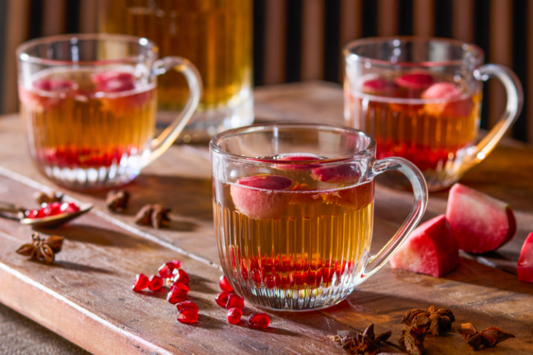 Een feestelijke Christmas Punch, gemaakt met frisse appelcider, witte wijn, brandy en een hint van kruiden zoals kaneel en steranijs.Deze punch wordt verrijkt met maple syrup voor een zoete, volle smaak en afgemaakt met verse appelschijfjes en granaatappelpitjes. Perfect om zowel koud als warm te serveren tijdens de feestdagen voor een warme, uitnodigende sfeer.Benodigdheden
