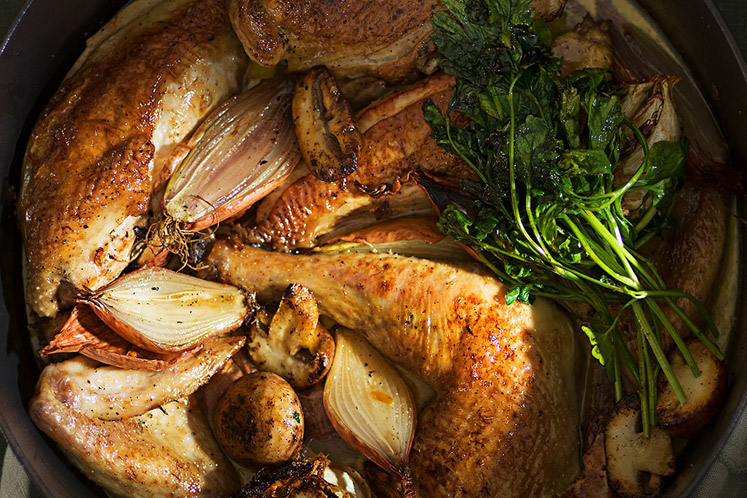 - Haal de kippendelen uit de braadslee en houd ze warm.