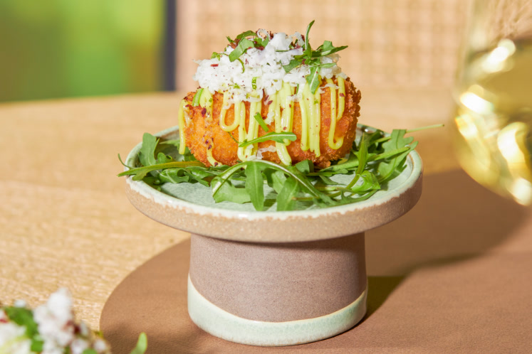 Kroketje met geitenkaasvulling, rasp van Murcia of pecorino, crème van rucola, limoenrasp, afgetopt met sumak.Dit gerechtje combineert door zijn licht vettige componenten goed met bijvoorbeeld een sauvignon blanc.
