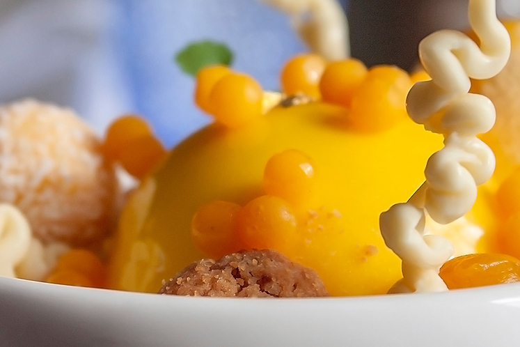 - Snijd een rijpe ananas in blokjes en marineer met de coulis en een scheut mango azijn.