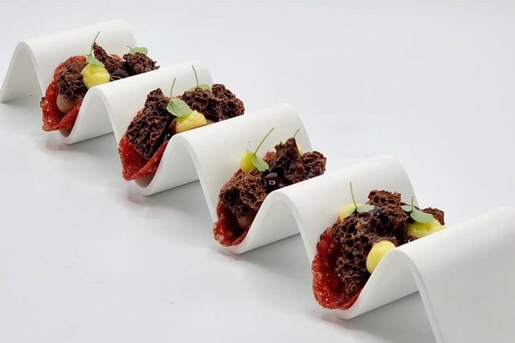 2. Spuit een toef Ganache monté op uw bord en fixeer hierop de taco van framboos.