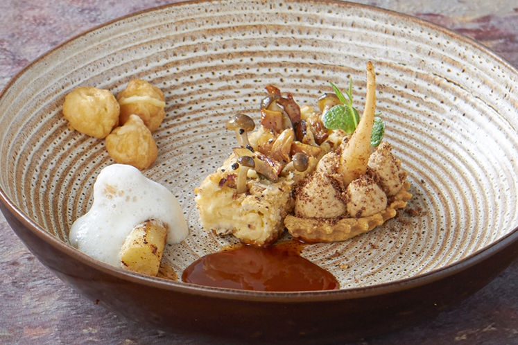 Dit gerecht bestaat uit: krokant aardappel ‘doosje’ gevuld met paddenstoelen, gougères, schorseneren, crumble van gerookte boter.Onze FoodXperience chefs maakten zich op voor het najaar! Ze gingen aan de slag met de typische ingrediënten van het najaar, zoals bijvoorbeeld wild en gevogelte. Maar ook bijzondere najaarsingrediënten als de bizon en parelhoen verschijnen weer op de werkbank. Dit keer namen onze chefs de uitdaging aan om van elk gerecht ook een volwaardige vegetarische variant te bereiden. Zo kunt u elk van uw gasten voorzien van een heerlijk najaarsgerecht!
