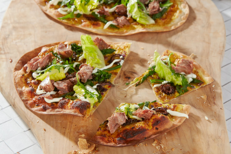 5. Garneer de flammkuchen af met limoenmayonaise en sla.