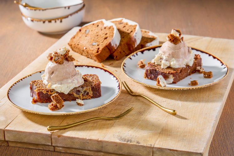 - Haal hier de bevroren plak carrot cake doorheen en bak om en om in boter tot deze warm is.