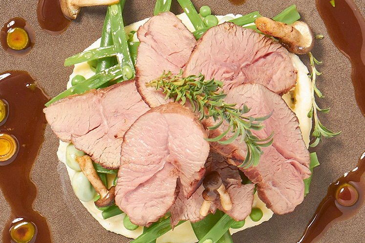 - Schik aardappelpuree op het bord, leg hierop de groenten. , Trancheer de lamsrump en leg op de voorjaarsgroenten.