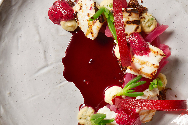 - Leg de bietjes op het bord, hierop de gegrilde tarbot.
