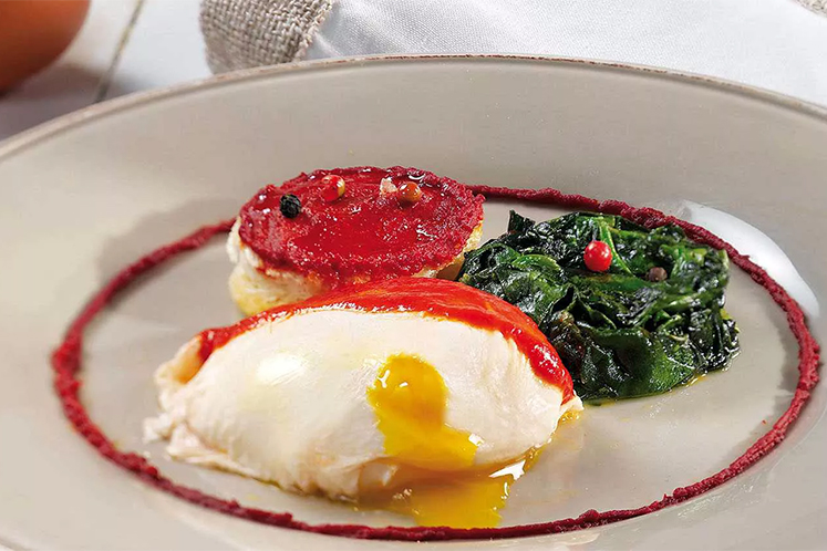Gepocheerd ei met crostini, spinazie en tomaat.Dit recept is bereid met authentieke Italiaanse tomaten van Mutti. Geen enkele tomaat uit blik is zo prachtig rood en natuurlijk van smaak als die van Mutti. Alle tomatenproducten worden gemaakt van 100% Italiaanse tomaten. Om de tomaten te ontvellen worden ze gepeld (unieke cold peel technologie) in plaats van gekookt: hiermee blijft de smaak van de verse tomaat behouden!