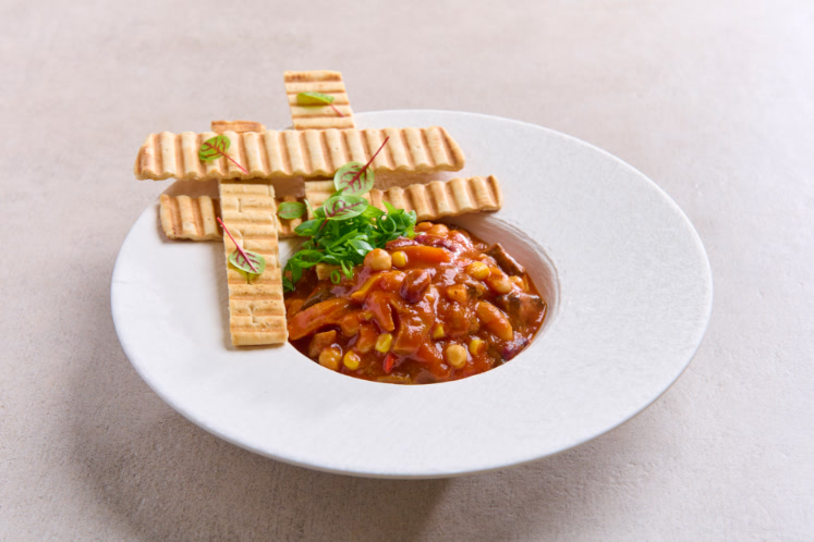 6. Voeg de kikkererwten, maïskorrels, witte bonen, rode kidneybonen en gemengde paprikareepjes toe en verhit door.