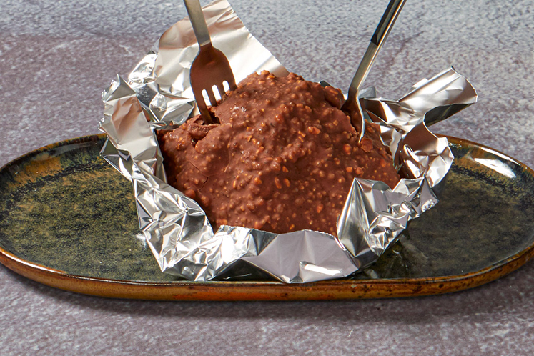 - Smelt de chocolade en voeg wat pindakrokant toe.