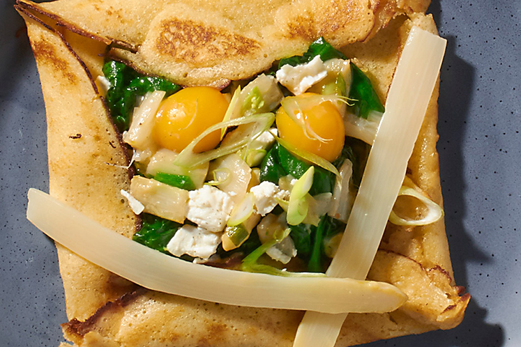 Hartige pannenkoek met spinazie, geitenkaas en asperge