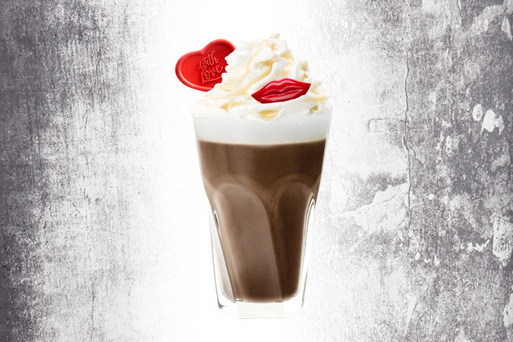 3. Garneer met een toef slagroom, Monin White Chocolate naar smaak, de red lip chocolate en het chocoladehartje.