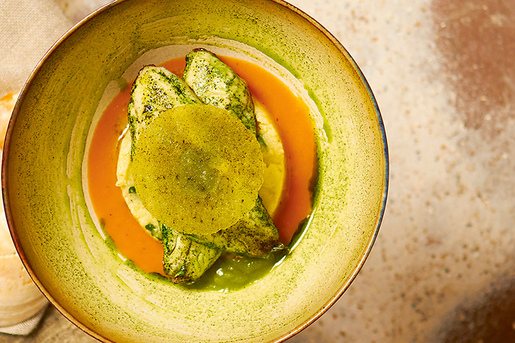 Gebakken mul in algenboter met romige ratatouillesaus en krokant brickdeeg met algenpoeder voor een verfijnde umamirijke presentatie.
