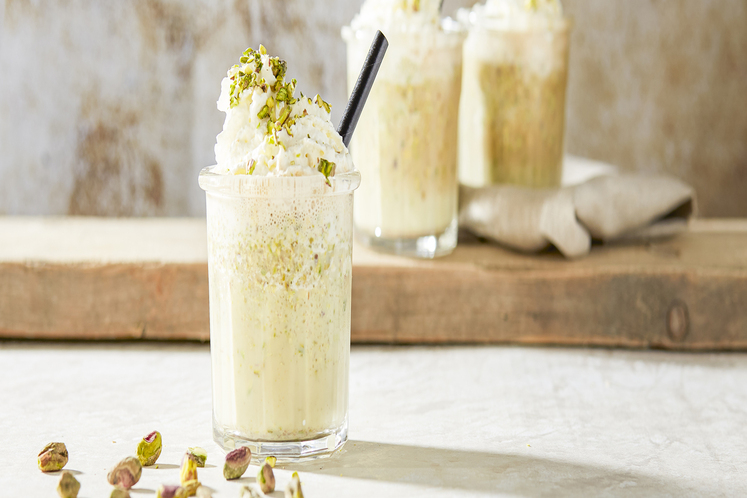 Frappuccino met karamel, pistache en amandelmelk, afgetopt met gehakte pistachenootjes.Benodigdheden