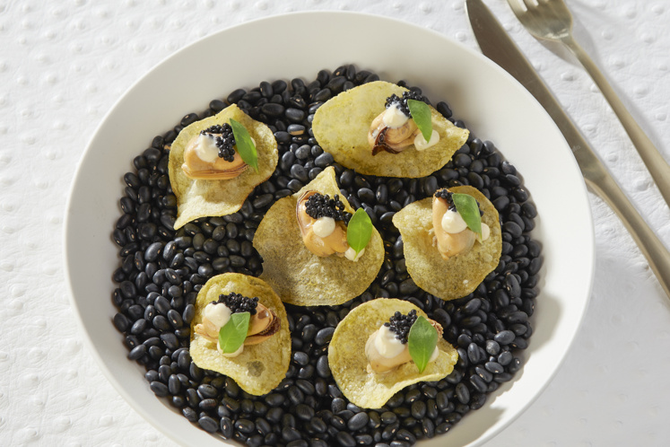 Chips van kaviaar, gekookte mossel en yuzu mayonaise