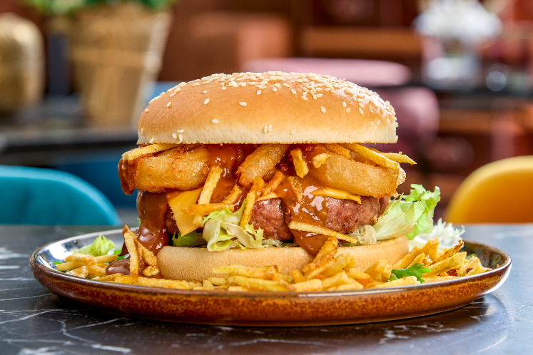 Burger met cheddar, gefrituurde onion rings, satésaus en krokante Indische frietsticks op een sesambun met frisse slamix.Benodigdheden