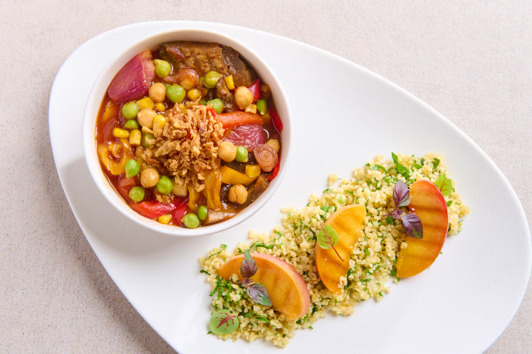 - Serveer de groenten in een kom op een bord en garneer met gebakken uitjes. Schep hiernaast een mooie portie bulgur, top af met de gegrilde perzik en een beetje cress.