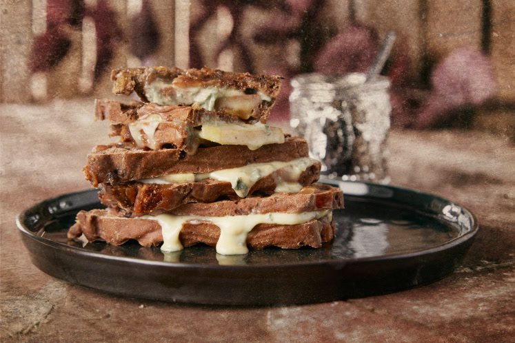 2. Beleg de plakken brood met dunne plakjes verse (geschilde) peer en een royale plak gorgonzola.