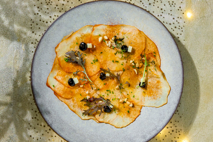 - Verdeel de knolselderijcarpaccio vervolgens op het bord.