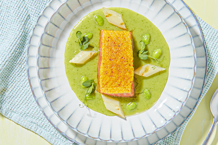Kropsla & cresson; een topcombinatie voor het voorjaar Dit recept bestaat uit: soep van kropsla en cresson zalm met een kerriekorst geroosterde asperges edamame boontjesBenodigdheden