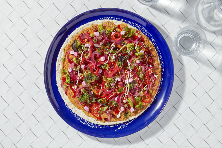 Turkse pizza, maar dan net even anders. Wij combineren de pizza met onder andere zuurkool, granaatappel, feta en een yoghurt-gembersaus.
