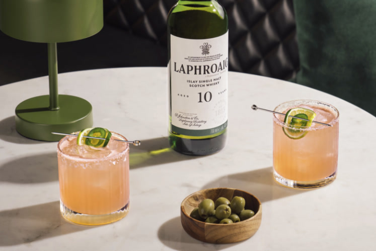 - Voeg 50 ml Laphroaig 10 YO, 50 ml grapefruitsap, 15 ml limoensap en 10 ml suikersiroop samen met wat ijsblokjes toe aan een cocktailshaker.