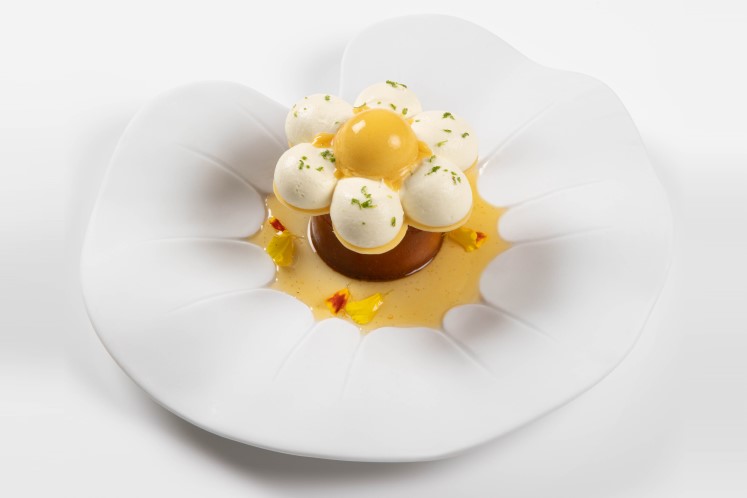 - Het dessert in het midden plaatsen en vervolgens een bolletje sorbet toevoegen in het midden van de bloemblaadjes.