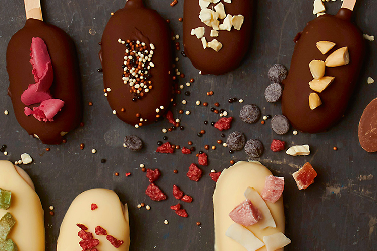Ijs op een stokje, omhuld met chocolade en afgewerkt met toppings naar keuze. Perfect voor bij de koffie, als dessert of als feestelijke traktatie.Gemaakt met de Silikomart mal 'Mini Classic'.