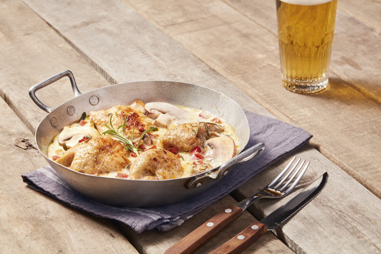 Ovenschotel van kippendijen in een knoflook-kaassaus van ERU Cheese Spread Gouda.