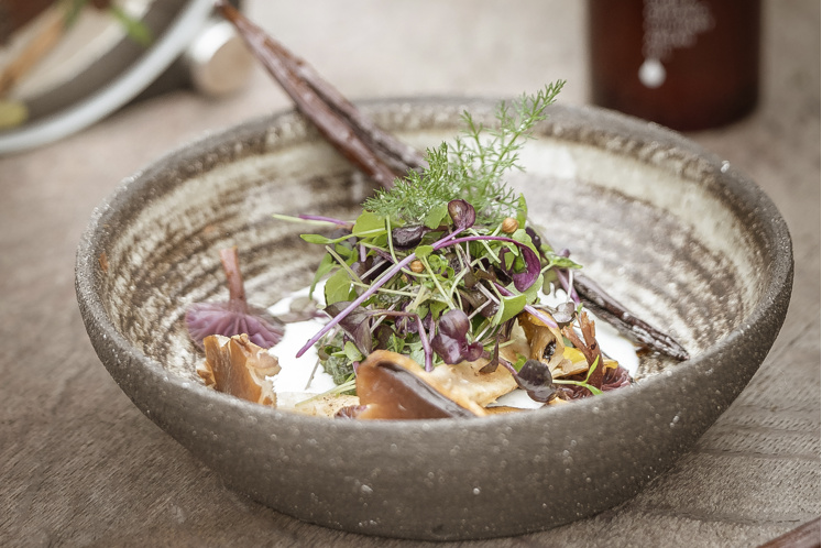 Paddenstoelentrilogie, vanilletomaatjes, cress salade en arganolie